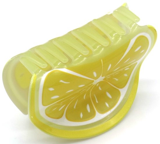 Vrolijke citroen haarclip van 8.5 centimeter lang. De haarclip heeft een stevige grip en zit comfortabel.