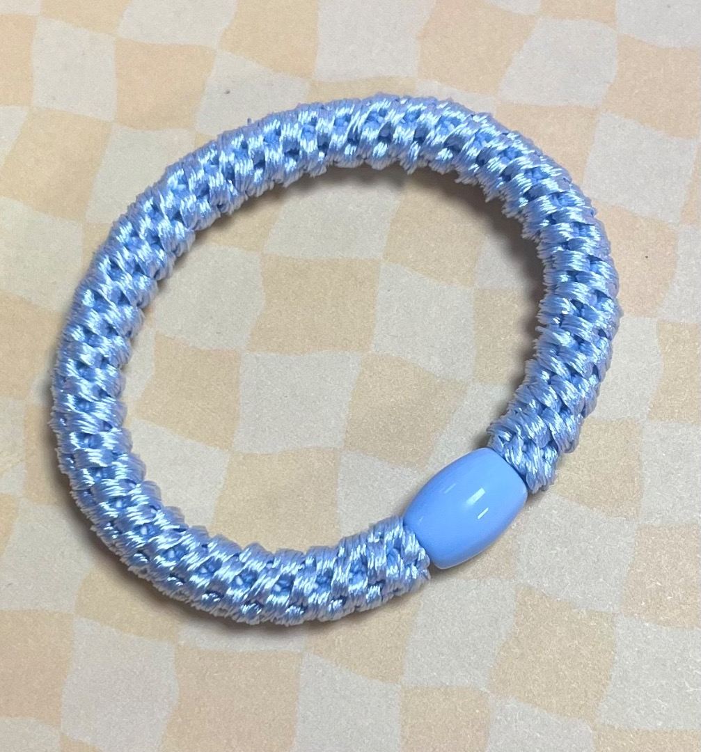 Deze blauwe haarelastiek kun je ook als armbandje gebruiken! Let op dat hij niet te strak zit!