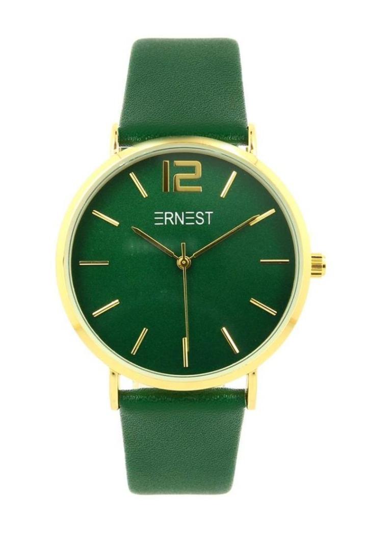 Chique horloge van het merk Ernest in een donkergroene kleur. Het horloge heeft een goudkeurige horlogekast gemaakt van roestvrij staal. Het horlogebandje is gemaakt van pu leder waardoor de kleur extra mooi uitkomt.
