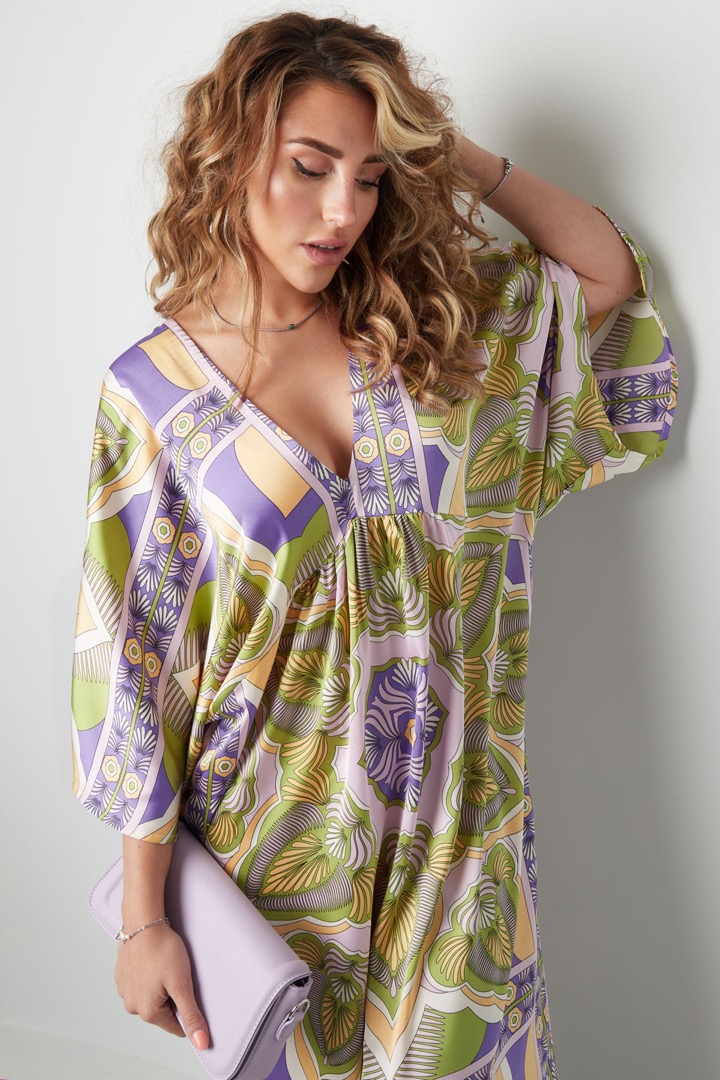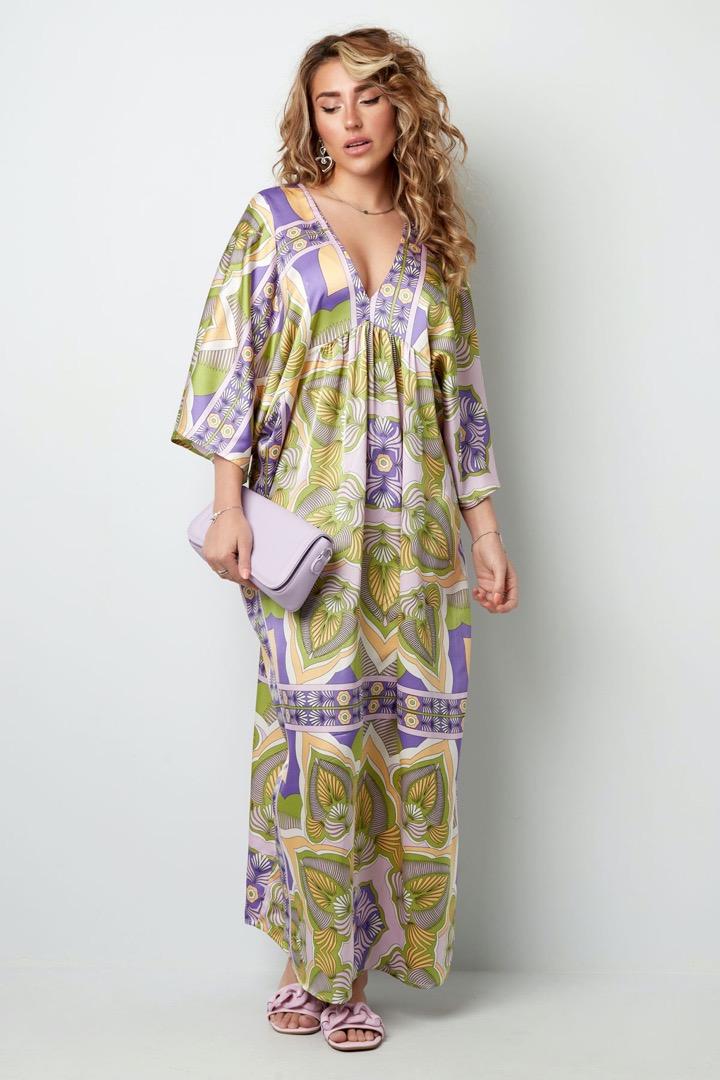 Prachtige maxi jurk met groen paarse print. Perfect voor zowel op het strand als op een chique feest! De jurk is super elegant en valt heel smooth. De jurk heeft een subtiele V-Hals en korte mouwen. Combineer de jurk met accessoires in dezelfde kleur en leuke slippers!