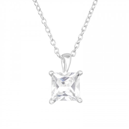 Prachtige ketting met vierakante kristal hanger in vork instelling. Deze ketting geef jou look een extra chique uitstraling. Perfect voor speciale gelegenheden. De ketting is gemaakt van 925 Sterling zilver en afgewerkt met een e-coat. De e-coat zorgt ervoor dat de ketting niet snel beschadigd en tegen verkleuringen.